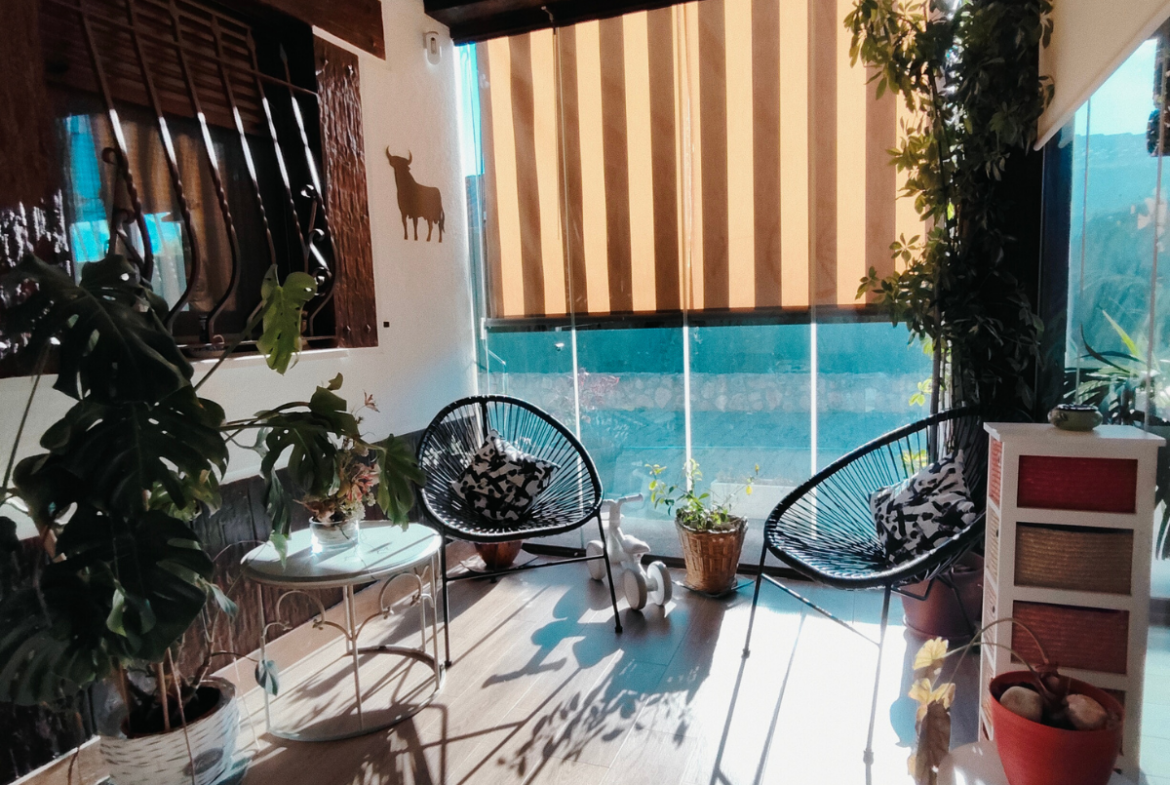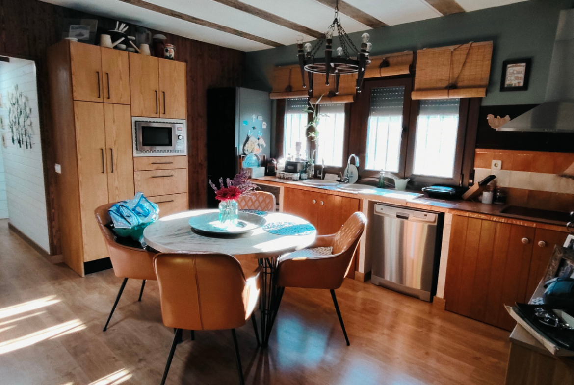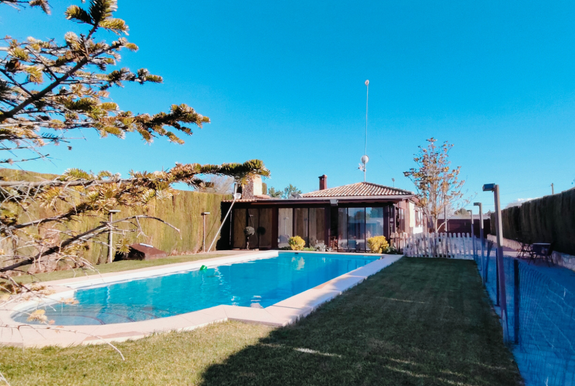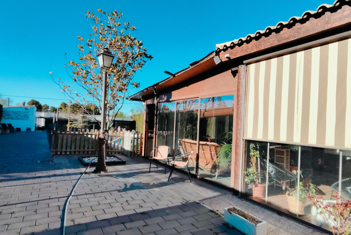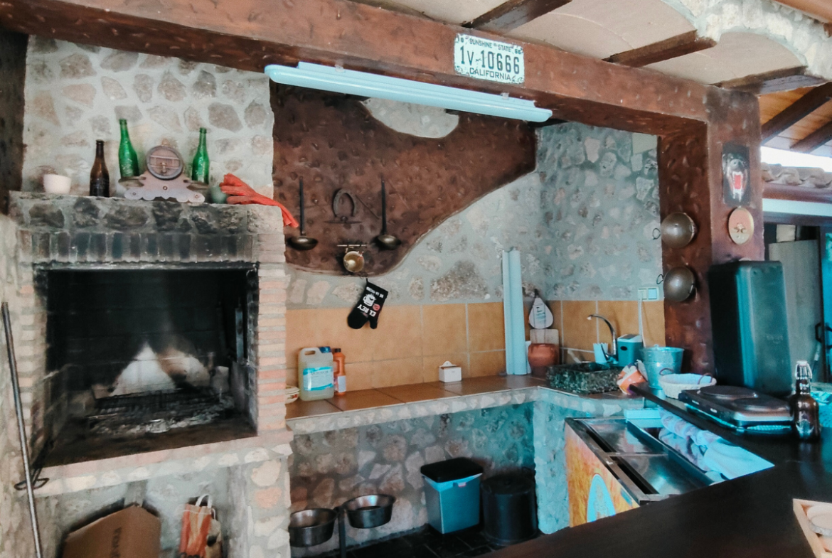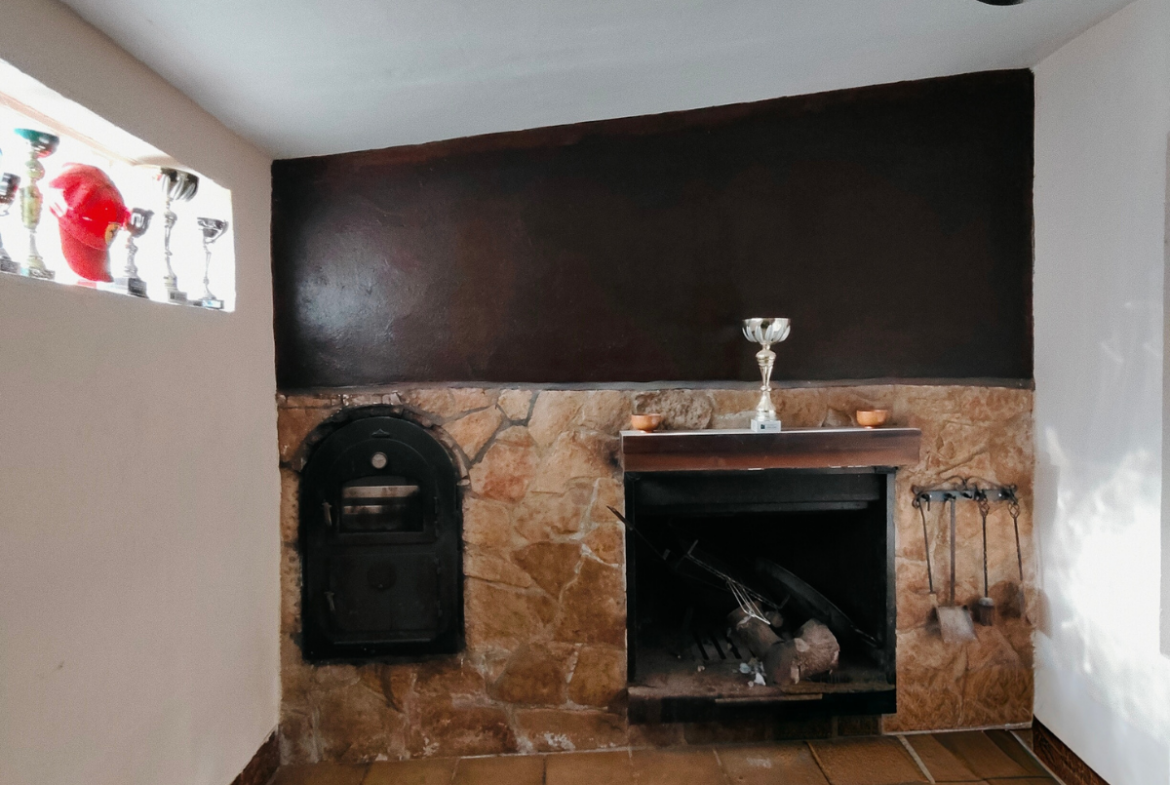 Además, la propiedad ofrece un porche acristalado de 35 m² aproximadamente con galería, zona de estar, barra de bar, barbacoa y aseo. También cuenta con garaje con capacidad para dos coches y una o dos motos, y una cocinilla independiente con horno de leña y chimenea.