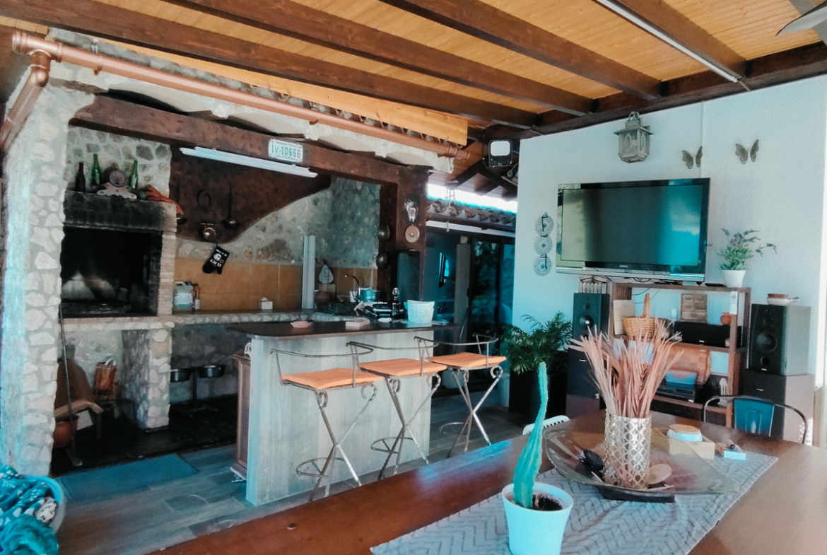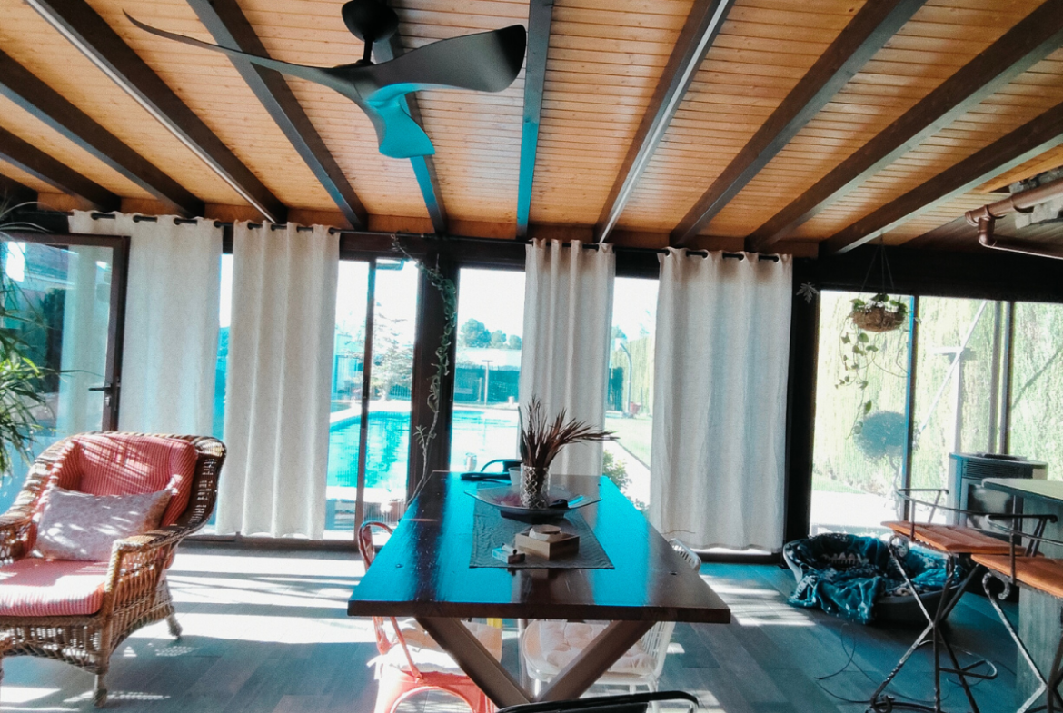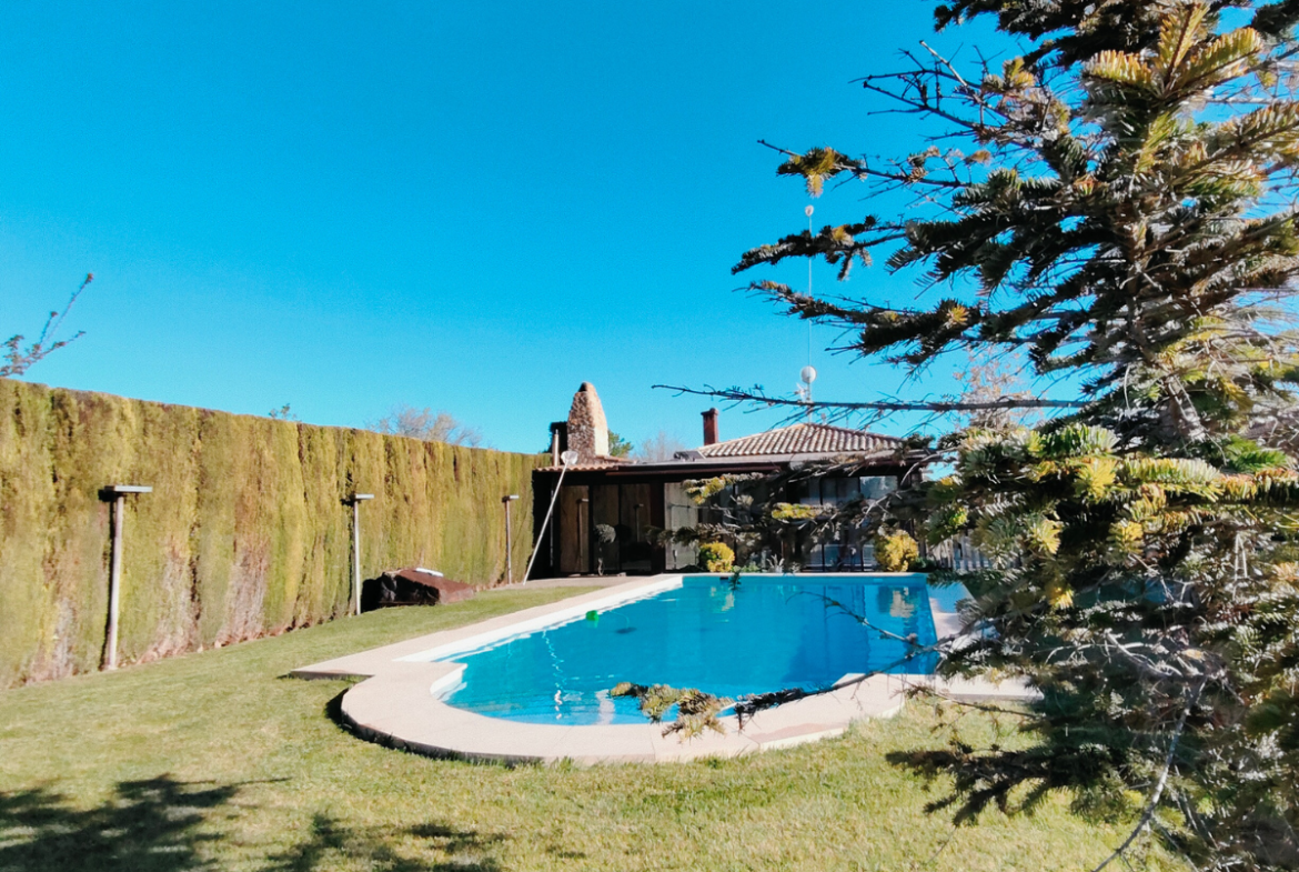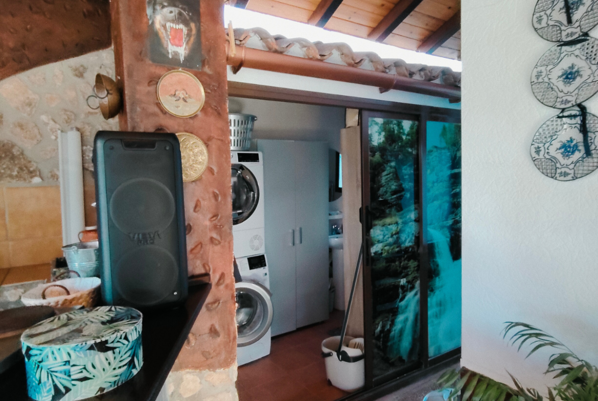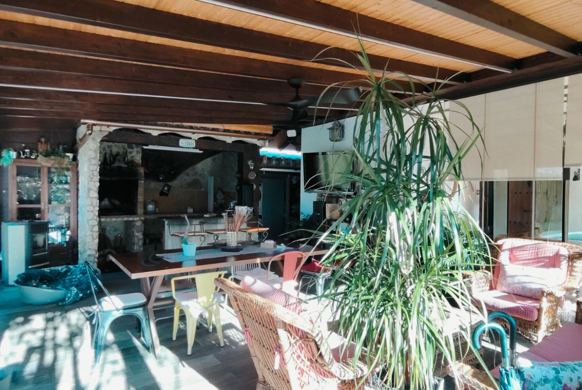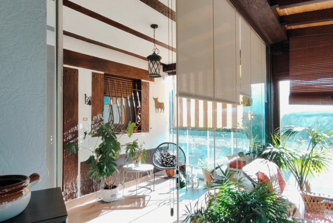 Además, la propiedad ofrece un porche acristalado de 35 m² aproximadamente con galería, zona de estar, barra de bar, barbacoa y aseo. También cuenta con garaje con capacidad para dos coches y una o dos motos, y una cocinilla independiente con horno de leña y chimenea.