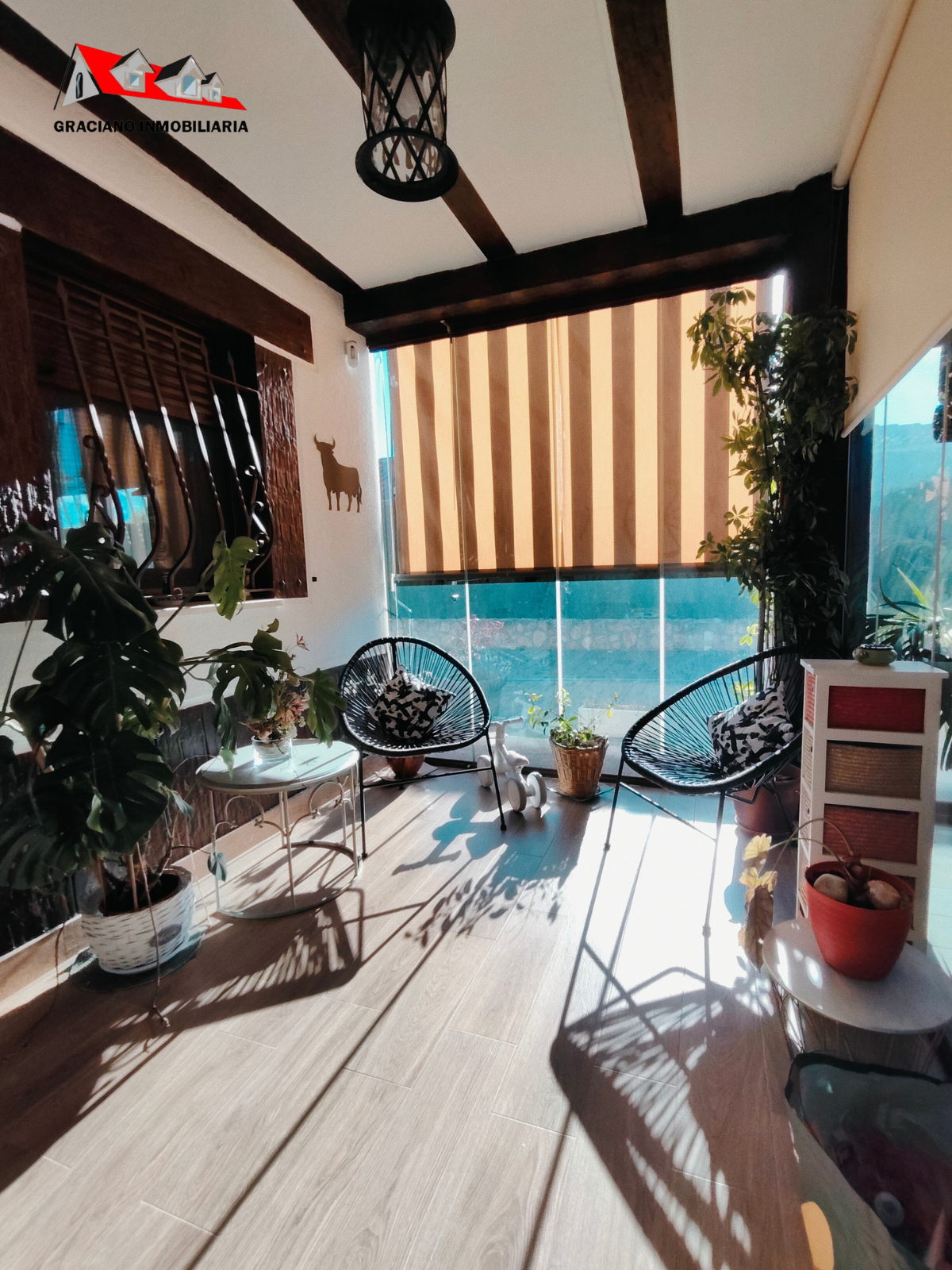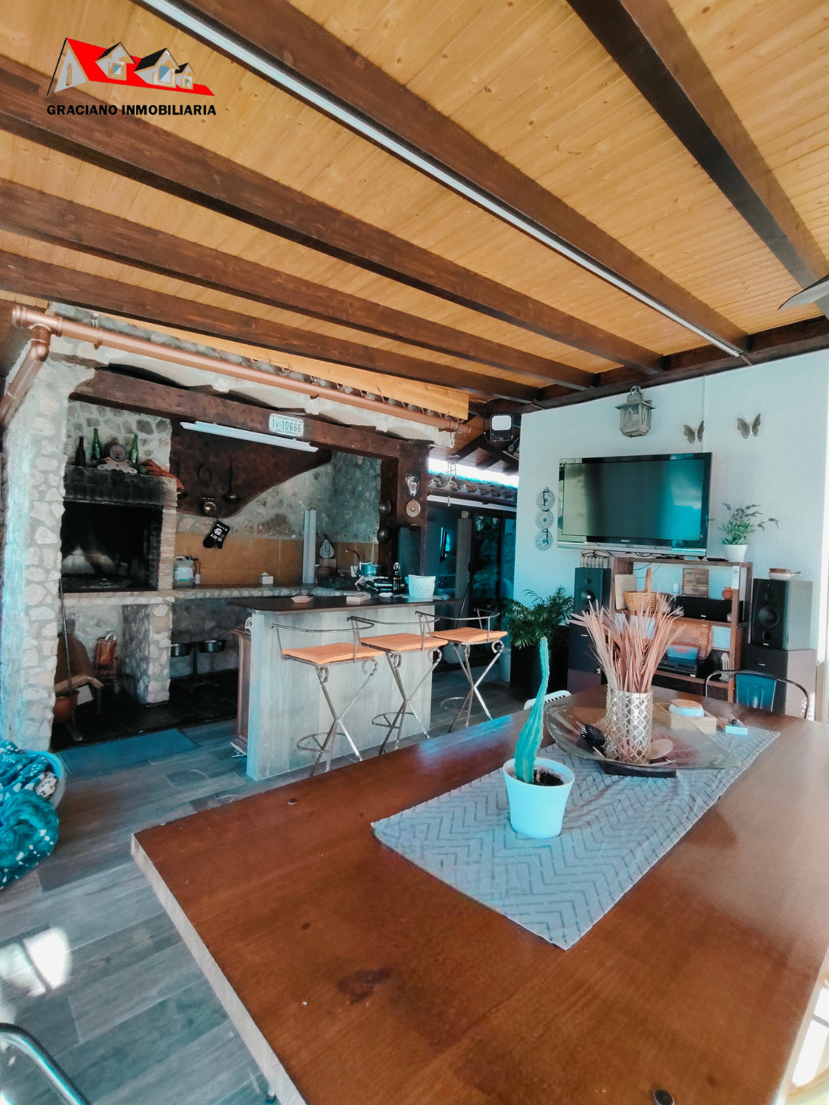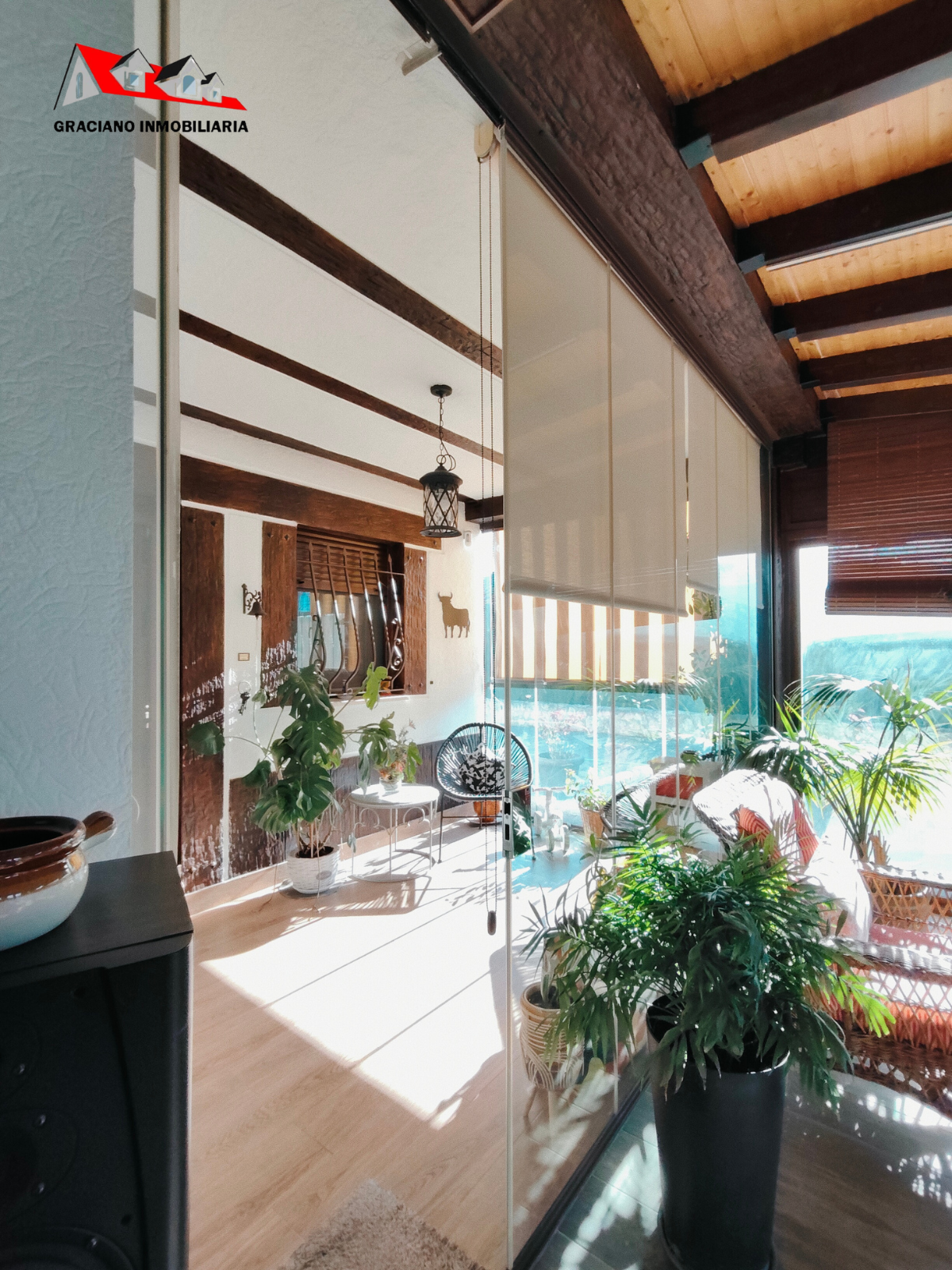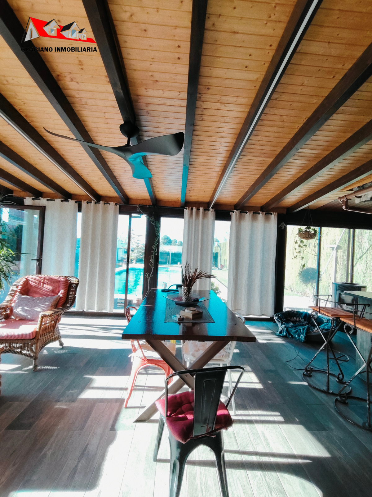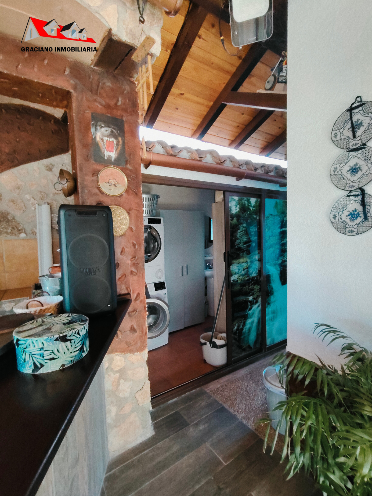 Además, la propiedad ofrece un porche acristalado de 35 m² aproximadamente con galería, zona de estar, barra de bar, barbacoa y aseo. También cuenta con garaje con capacidad para dos coches y una o dos motos, y una cocinilla independiente con horno de leña y chimenea.